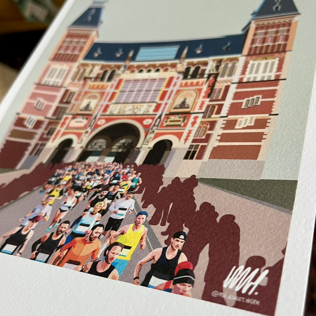 Ter ere van deze mijlpaal ontwierp ik speciale marathonprints: een ode aan de lopers én aan Amsterdam. Op de print zie je lopers onder het Rijksmuseum, rond het 4 km-punt – een krachtig en herkenbaar moment. Verkrijgbaar in een standaardversie en een gepersonaliseerde uitvoering met jouw naam, finishtijd en startnummer.
