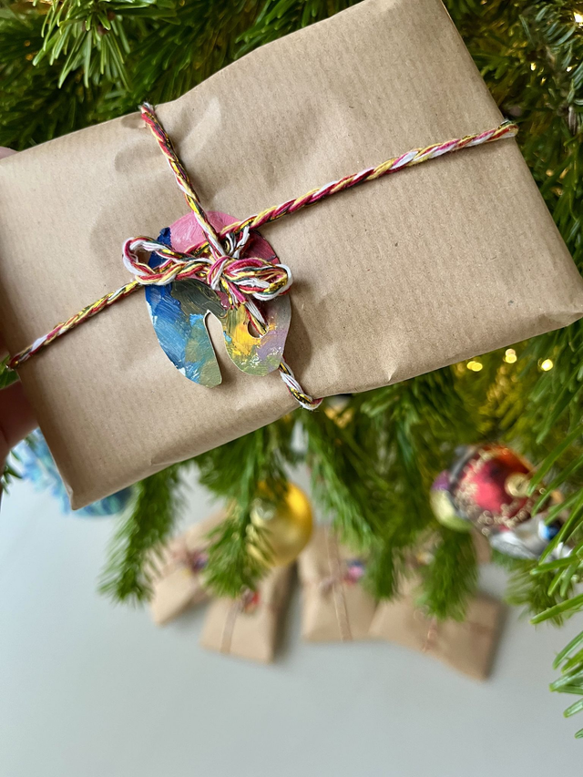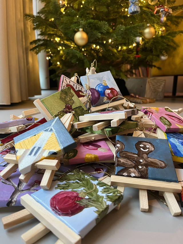 Each mini canvas (7×7 cm) is hand-painted in oil paint and finished with a protective varnish. Every ARTNAMENT comes with a matching mini easel and a loop for hanging in the tree. They are safely wrapped in bubble wrap before being sent via letter post.