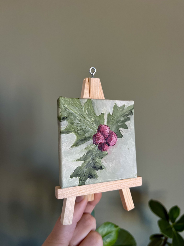 Each mini canvas (7×7 cm) is hand-painted in oil paint and finished with a protective varnish. Every ARTNAMENT comes with a matching mini easel and a loop for hanging in the tree. They are safely wrapped in bubble wrap before being sent via letter post.