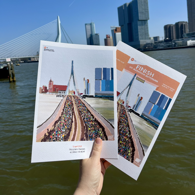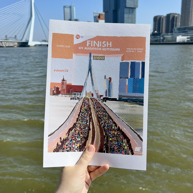 Ter herinnering aan deze bijzondere prestatie ontwierp ik unieke marathonprints. Perfect als cadeau voor jezelf of een andere hardloopliefhebber. De print toont het moment waarop de lopers de Erasmusbrug trotseren – een eerbetoon aan die magische 42,195km én aan de stad.