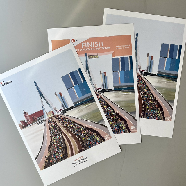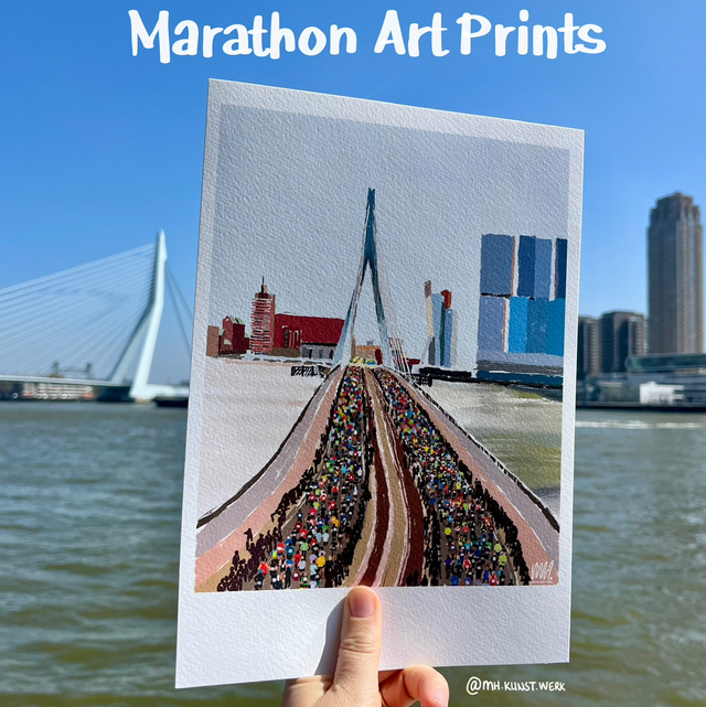 Ter herinnering aan deze bijzondere prestatie ontwierp ik unieke marathonprints. Perfect als cadeau voor jezelf of een andere hardloopliefhebber. De print toont het moment waarop de lopers de Erasmusbrug trotseren – een eerbetoon aan die magische 42,195km én aan de stad.